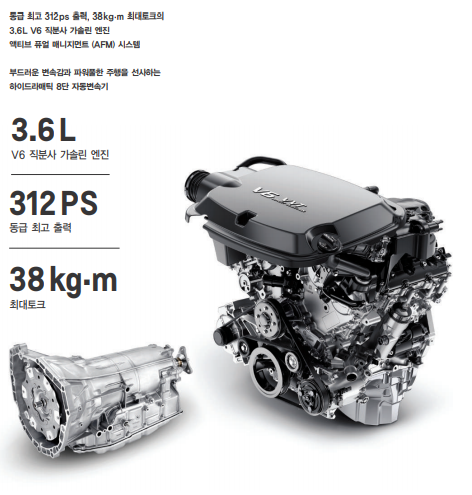 ● 파워트레인/성능 : 3.6L V6 직분사 가솔린 엔진, 하이드라매틱 8단 자동변속기, 2WD(후륜구동),