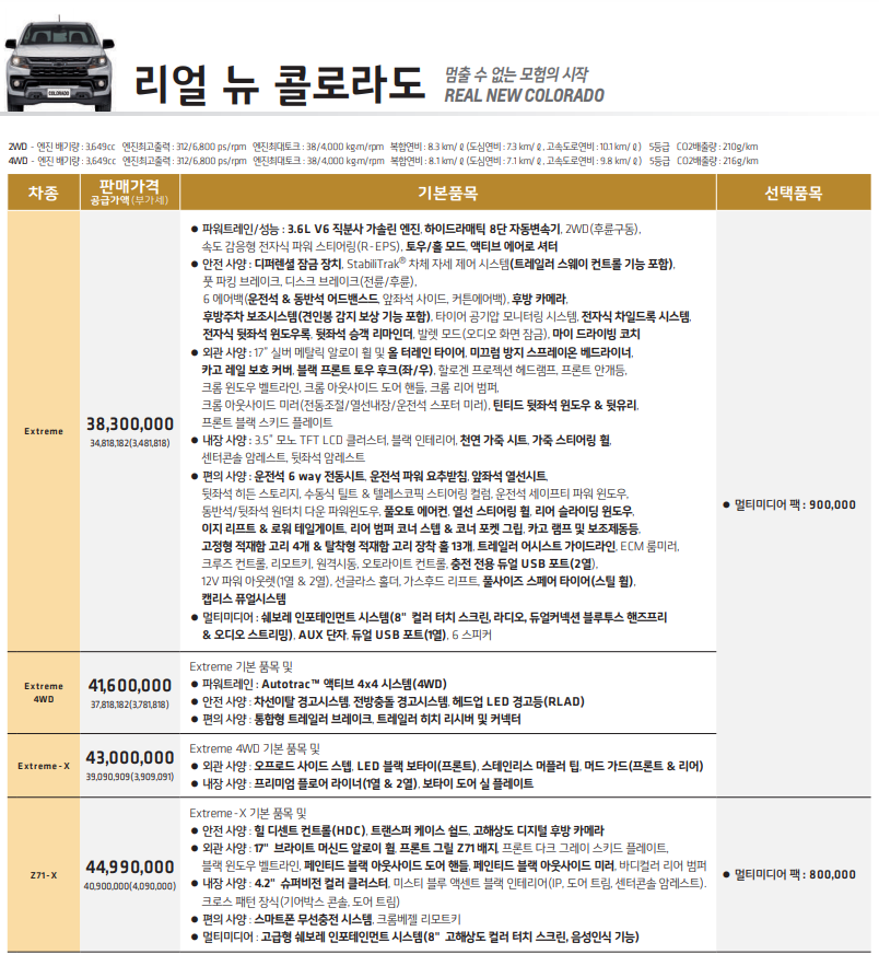 4천만 원대의 쉐보레 콜로라도 트림별 구성 옵션과 가격을 자세히 알아보겠습니다.