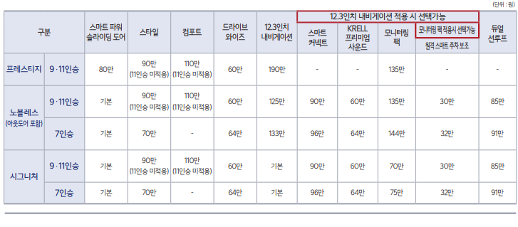 2022 신형 카니발은 프레스티지, 노블레스, 시그니처로 3가지 트림으로 나누어 판매 중입니다.
