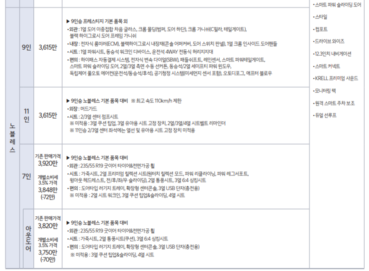 카니발 프레스티지 기본 품목 모두 포함 이외