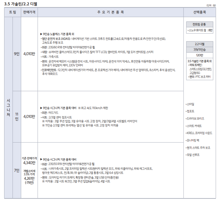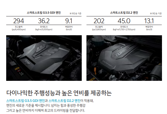 - 스마트 스트림 3.5 엔진/디젤 2.2 엔진