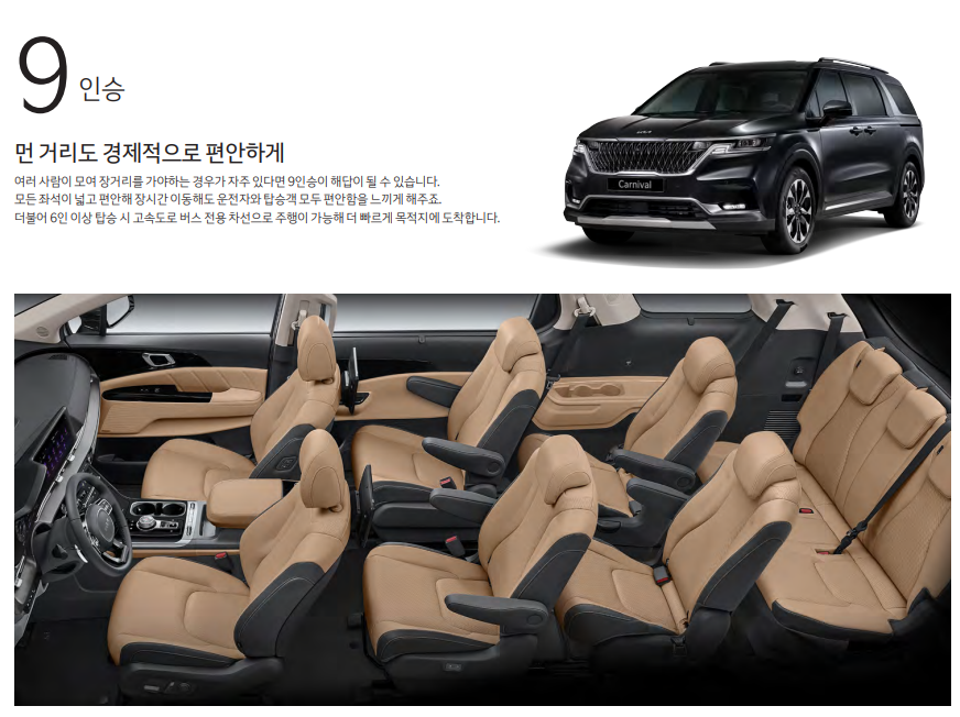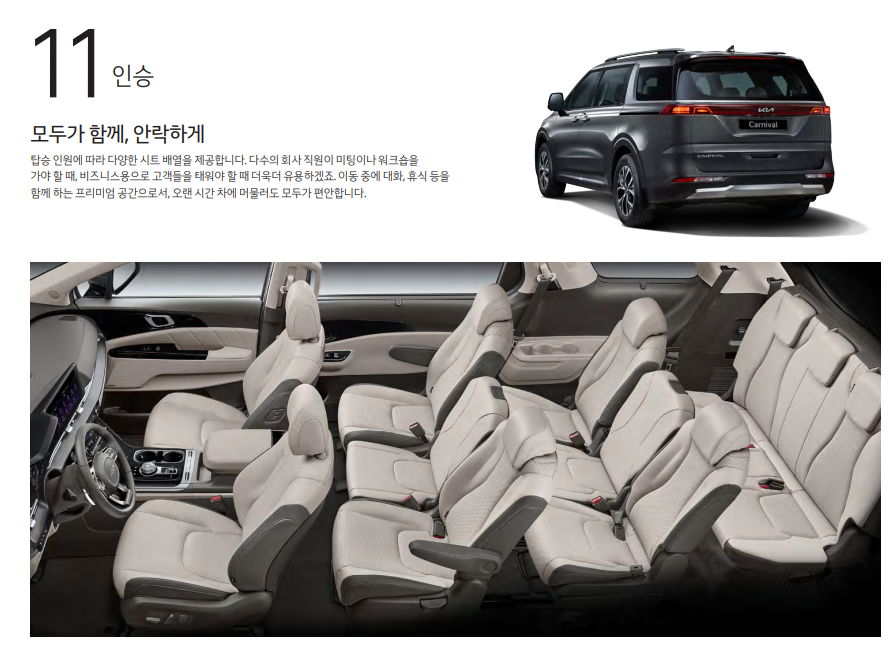 카니발은 9인승/ 11인승으로 대표적으로 나누어져 있습니다.