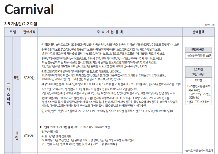 카니발 프레스티지부터 옵션, 구성, 가격을 살펴보겠습니다.