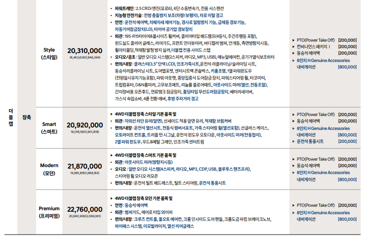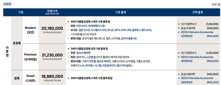 ▶ 2WD 더블캡 초장축 모던 기본 품목 및