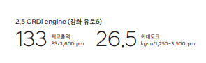 • 파워트레인 : 2.5 CRDi 엔진(유로 6), 6단 수동변속기