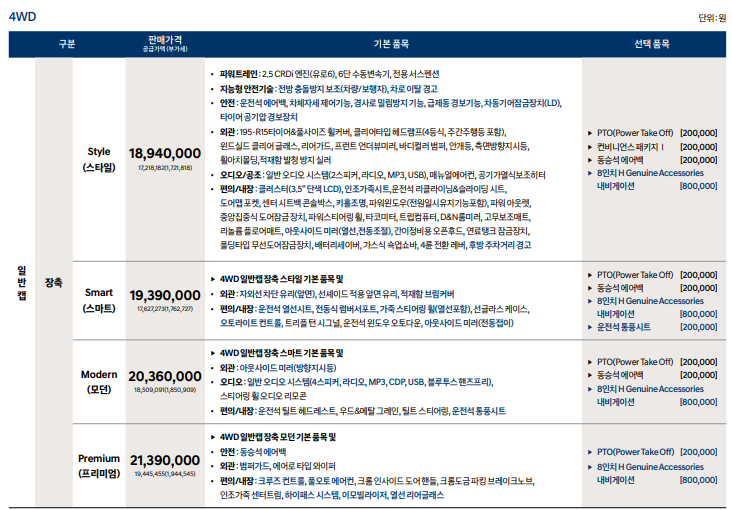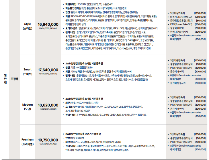 ▶ 2WD 일반캡 초장축 모던 기본 품목 및