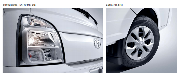 • 외관 : 195-70-R15/145-R13 타이어&풀사이즈 휠 커버, 클리어 타입 헤드램프(4등식, 주간 주행 등 포함),