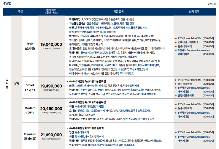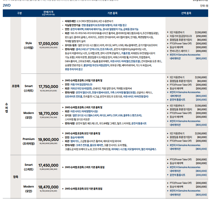 ▶ 2WD 슈퍼캡 초장축 모던 기본 품목 및