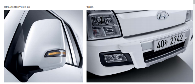 윈드실드 클리어 글라스, 리어 가드, 프런트 언더 뷰 미러, 바디컬러 범퍼, 안개등, 측면 방향지시등,
