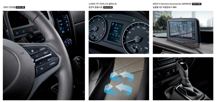 • 편의/내장 : 크루즈 컨트롤, 풀오토 에어컨, 크롬 인사이드 도어 핸들, 크롬 도금 파킹