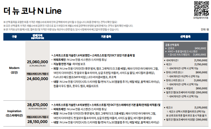 더 뉴 코나 n 라인은 25,060,000원부터 시작합니다.