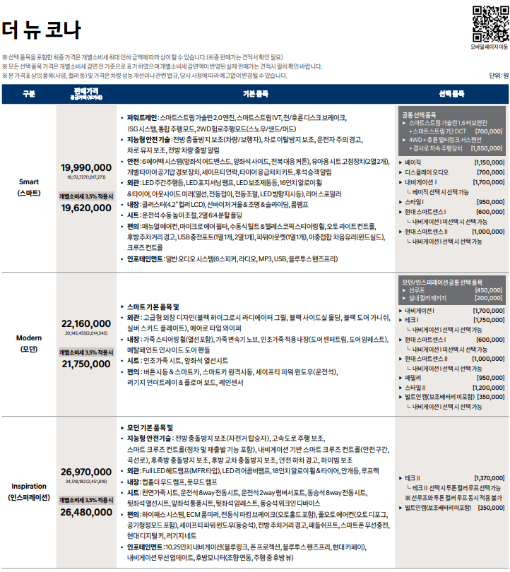 코나 판매하는 트림의 경우 스마트, 모던, 인스퍼레이션 등으로 나누어져 있습니다.