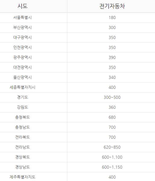 서울 전기차 보조금의 경우 180만 원으로 가장 낮습니다.