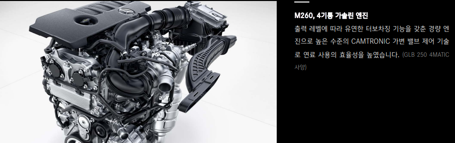 glb 250 가솔린 모델 출력은 224마력입니다. 200마력이 넘는 힘으로 충분한 주행성능을 확보하고 있습니다. 가솔린 2000cc 엔진을 적용했음에도 충분한 출력을 발휘하는 glb250입니다.