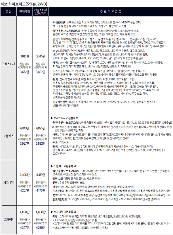 쏘렌토 하이브리드는 프레스티지, 노블레스, 시그니처, 그래비티 등급의 차량으로 나누어집니다. 쏘렌토 하이브리드는 2륜 구동 모델과 4륜 구동 awd 모델로 구동방식이 구분됩니다. 2023 쏘렌토 하이브리드 트림별 가격에 대하여 알아보겠습니다.