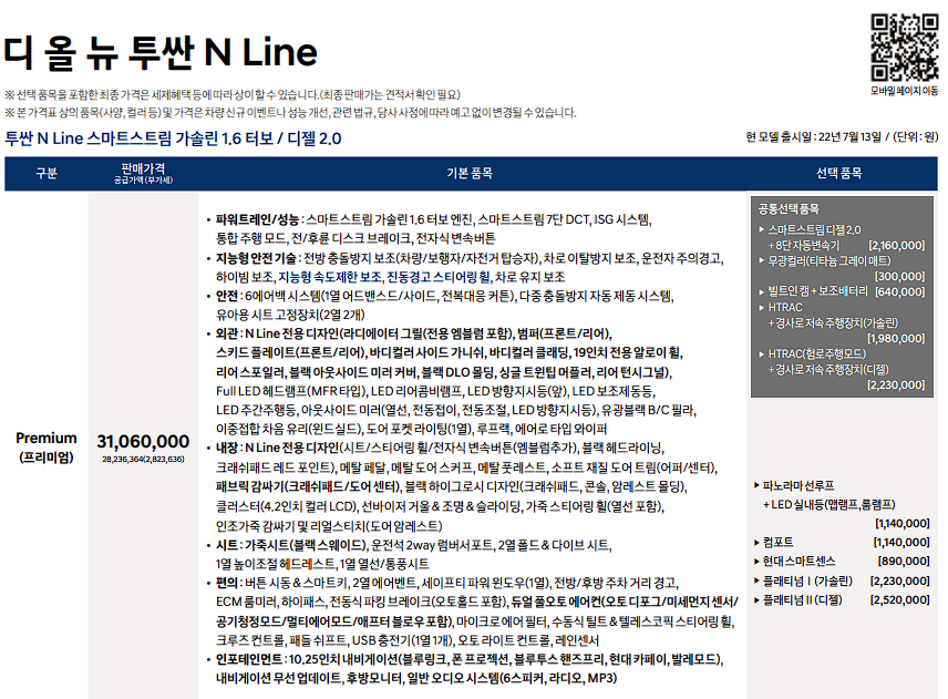 투싼 N 라인 N-line 가격표