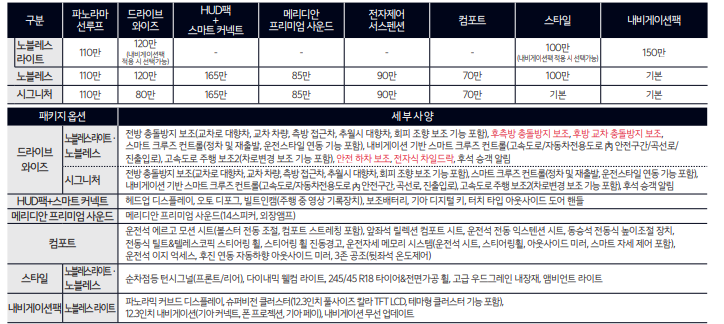 k8 하이브리드 차량은 노블레스 라이트, 노블레스, 시그니처 등급으로 나누어져 있습니다.