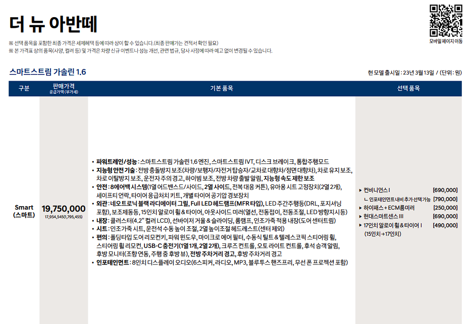 아반떼 스마트 트림 가격은 19,750,000원입니다.