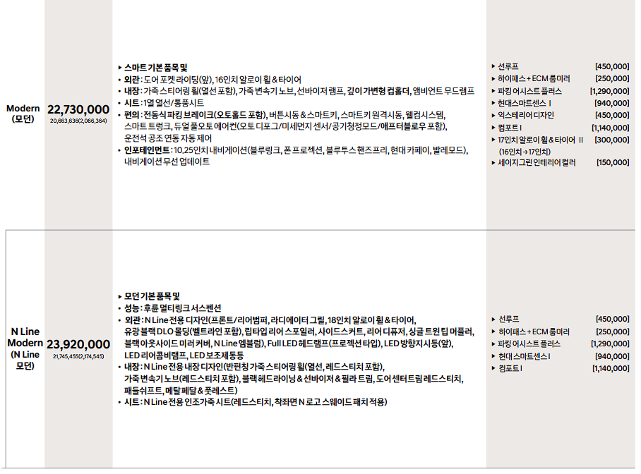 아반떼 N line 가격은 모던트림 23,920,000원입니다. 아반떼 N line 인스퍼레이션 가격은 27,800,000원입니다.