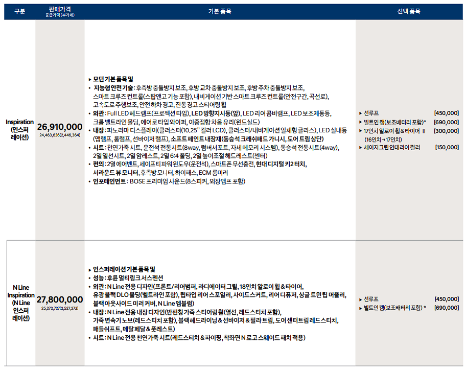 아반떼 인스퍼레이션 가격은 26,910,000원입니다.