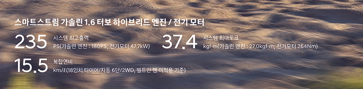 싼타페 하이브리드는 1.6 가솔린 터보 엔진을 적용합니다. 하이브리드 엔진/ 전기모터가 적용됩니다. 싼타페 하이브리드 최고출력은 235마력입니다. 전기모터 힘이 더해져 최대 토크는 37입니다.