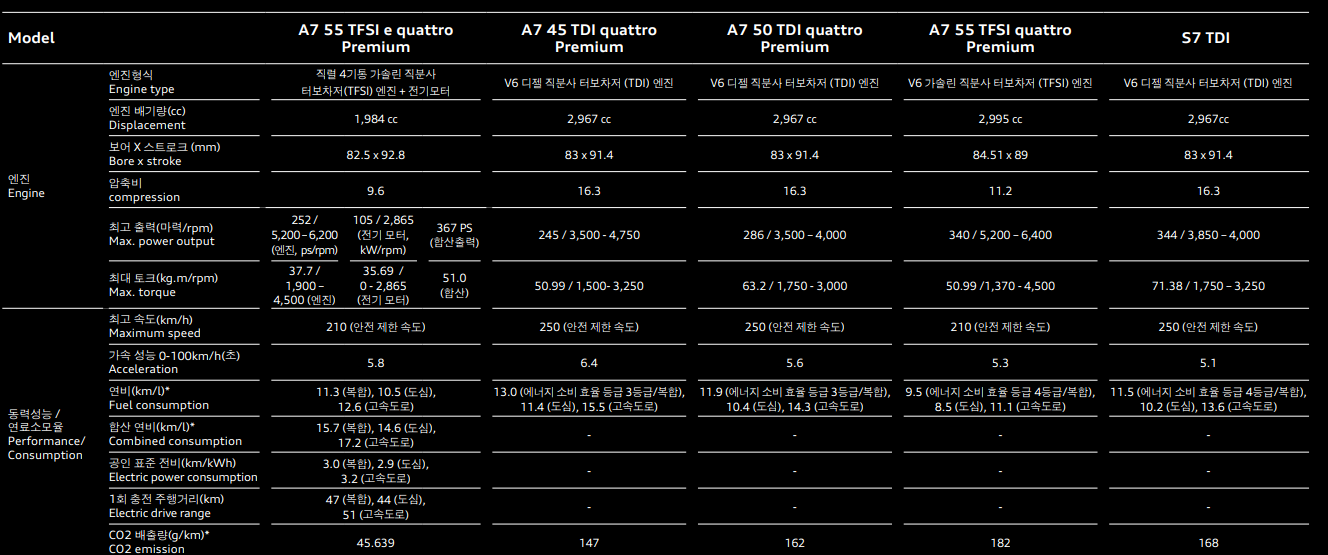 아우디 a7, 제원을 살펴보면 모델별로 서로 다른 스펙을 보유하고 있습니다.