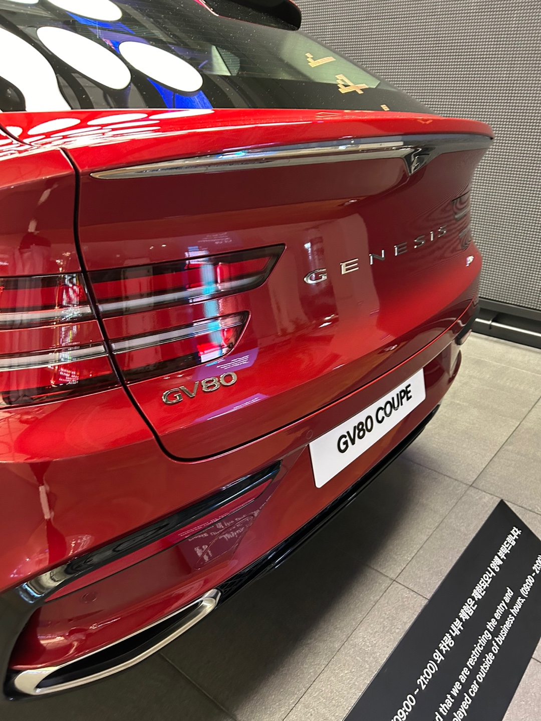 gv80은 쿠페형 suv 차량으로 기존의 gv80 에 비하여 스포티한 모습이 특징입니다. 실내 디자인은 gv80과 유사하며, c필러 디자인과 트렁크 디자인에서 차별점을 두었습니다.