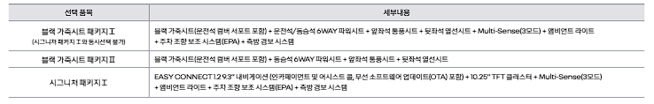 시그니처 패키지는 내비게이션과 무드등, 주차 조향 보조 시스템, 측방 경보 시스템이 포함됩니다.