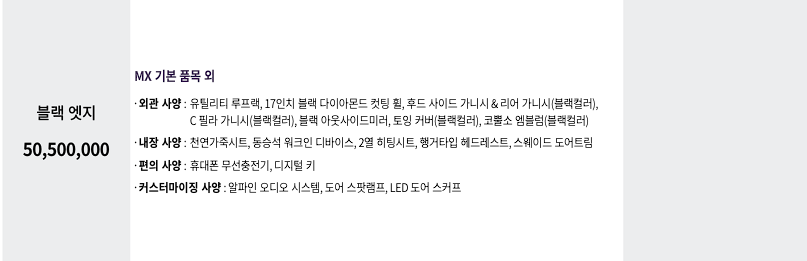 등의 다양한 옵션이 기본 트림 mx에 탑재됩니다.