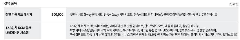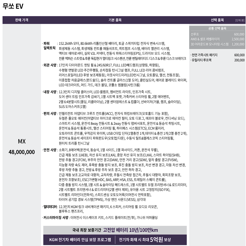 무쏘 ev 선루프 60만원, 4륜 시스템 150만 원,