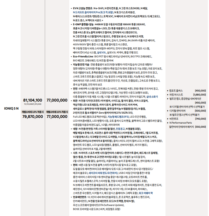 아이오닉 5n 가격은 2025 모델이 7,700만 원입니다. 전기차 보조금 지급도 절반만 가능하여, 사실상 실 구매가 2025 아이오닉 5n은 7천만 원대로 고가입니다.
