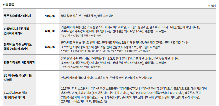 액티언은 아이신 6단 변속기, 20인치 휠, 12.3인치 계기판, 실내 무드등, 12.3인치 내비게이션 등의 옵션이 기본 탑재됩니다.