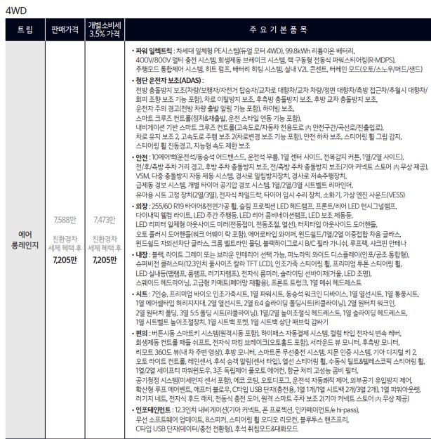 사륜 구동인 4wd 모델은 400만 원가량 추가됩니다.
