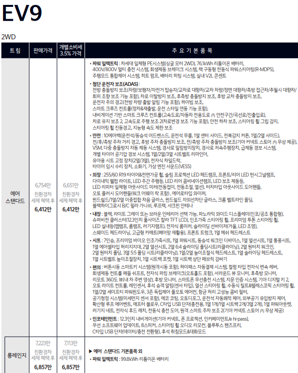 ev9 가격은 트림별, 배터리 용량에 의해 정해집니다.