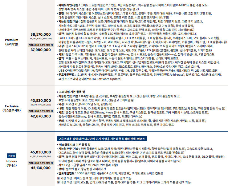 아너스 트림이 추가되었으며, 트림별 가격이