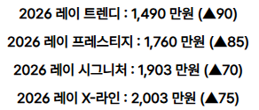 2026년형 레이 전 트림에서 70~90만원 가격 인상