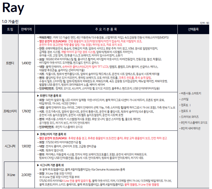 다만, 전기차 레이 ev를 선보이면서 엔진 라인업이 2가지로 늘어났습니다.
