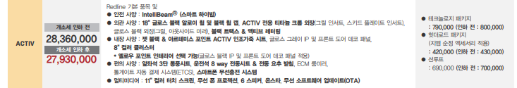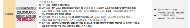 다음 트림 레드라인과는 4백만원 차이가 발생하며 레드라인은 2,565만 원으로 깡통 트림보다 400만 원가량 비쌉니다.