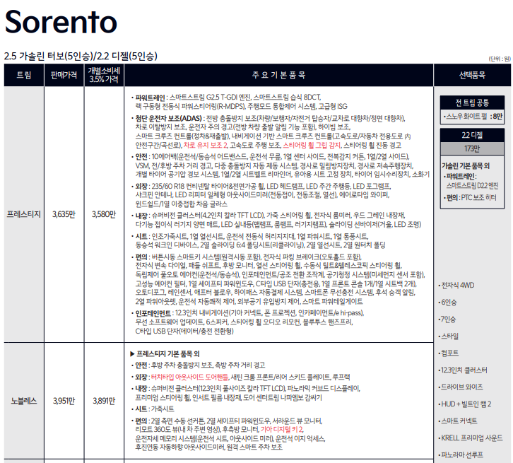 쏘렌토 2026 연식변경 출시로 옵션 대비 상품성이 극대화되어 실구매자들 사이에서 탄탄한 옵션으로 칭찬을 받고 있습니다.