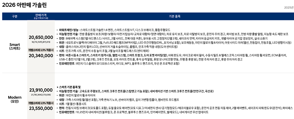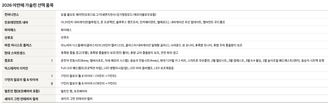 2026 아반떼 가솔린 가격표