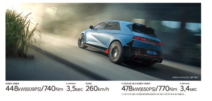 아이오닉 6n은 448kw 출력으로 마력으로 치면 609마력입니다. 엄청난 출력으로 제로백은 3.4초입니다.