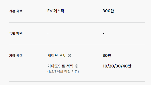 기본적인 혜택은 따로 제공되지 않으며, 세이브 오토와 기아 포인트 적립을 최대 30만 원 할인 가능합니다.