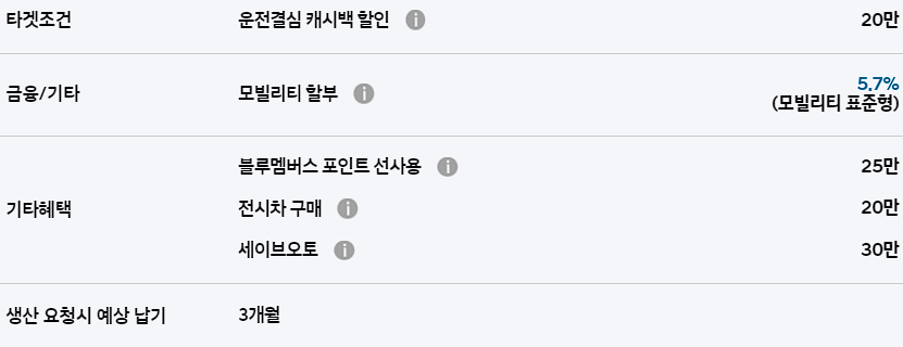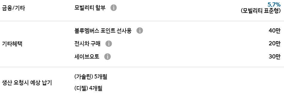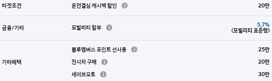 운전결심 캐시백 할인, 모빌리티 할부, 블루멤버스 포인트 선사용 등의 기본적인 혜택이 제공됩니다.