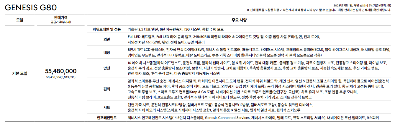 5천만 원대 제네시스 G80 깡통 가격 옵션 정보