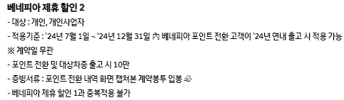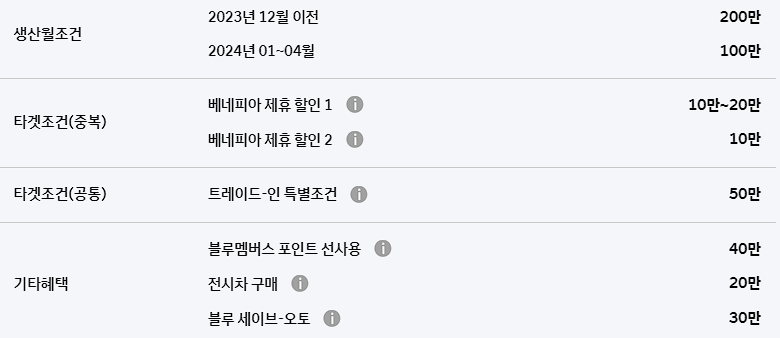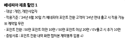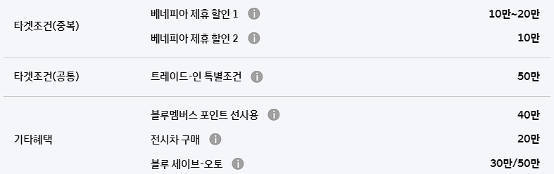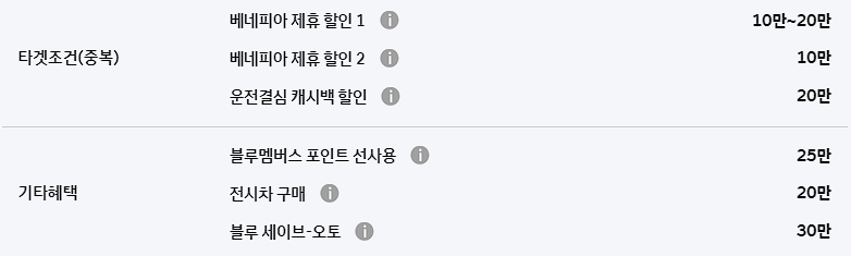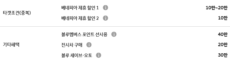 베네피아 제휴 할인은 베네피아 포인트 전환 고객이 출고시 할인이 가능합니다. 베네피아 제휴 할인 2 혜택은 베네피아 포인트 전환 고객이 10만 원의 할인을 받을 수 있는 것입니다. 베네피아 1과 중복 적용 불가능합니다.