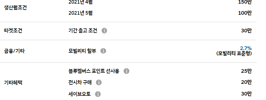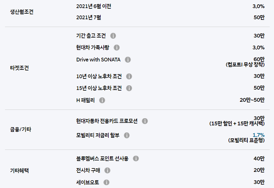 - 대상 : 개인, 개인사업자,법인 직구매 고객 중 21년 7월 이전 생산 재고 차량 출고 고객