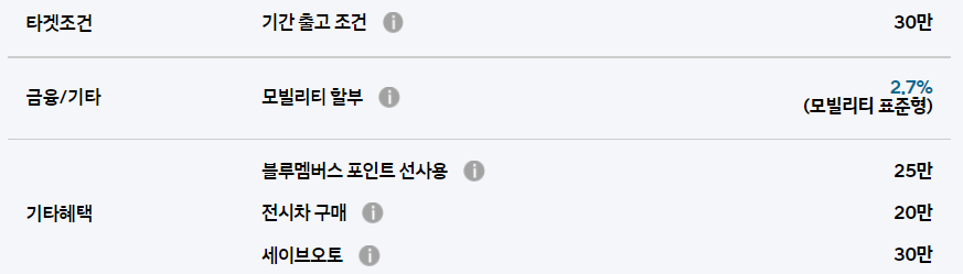 - 혜택 : 50만 추가 혜택(30만 할인 + 20만 캐시백)