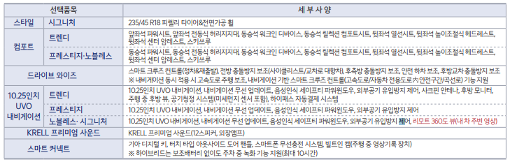 •내장 : 슈퍼비전 클러스터(12.3인치 풀사이즈 칼라 TFT LCD/10.25인치 UVO 내비게이션 선택시 테마형 클러스터 기능 지원),