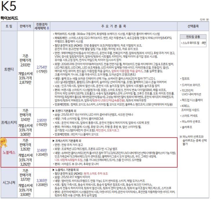 k5 하이브리드는 총 4가지 트림으로 판매합니다.