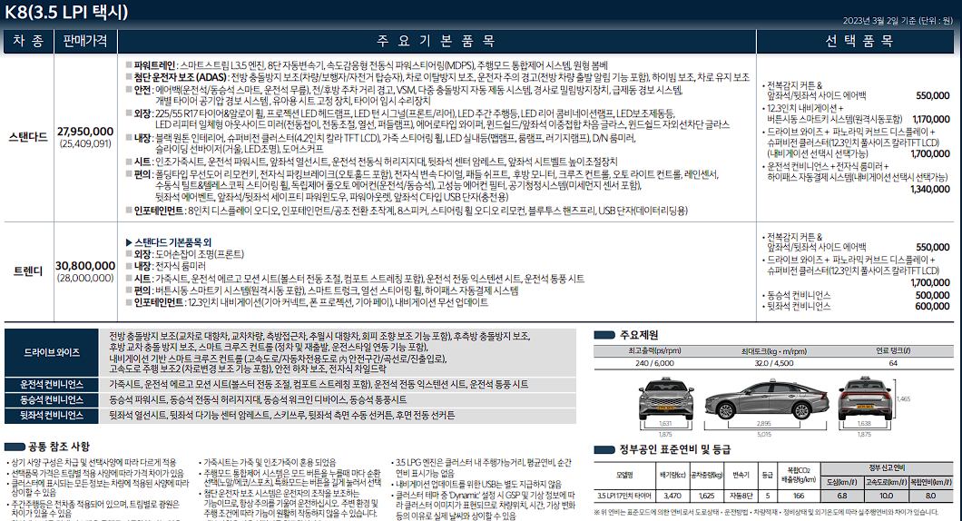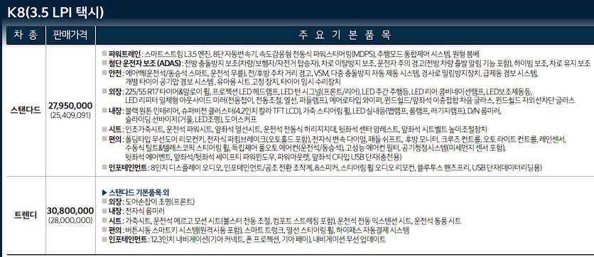 LPi 일반 모델에 비하면 옵션 몇 가지를 빼고 상대적으로 저렴하게 출시된 K8 택시 모델입니다.